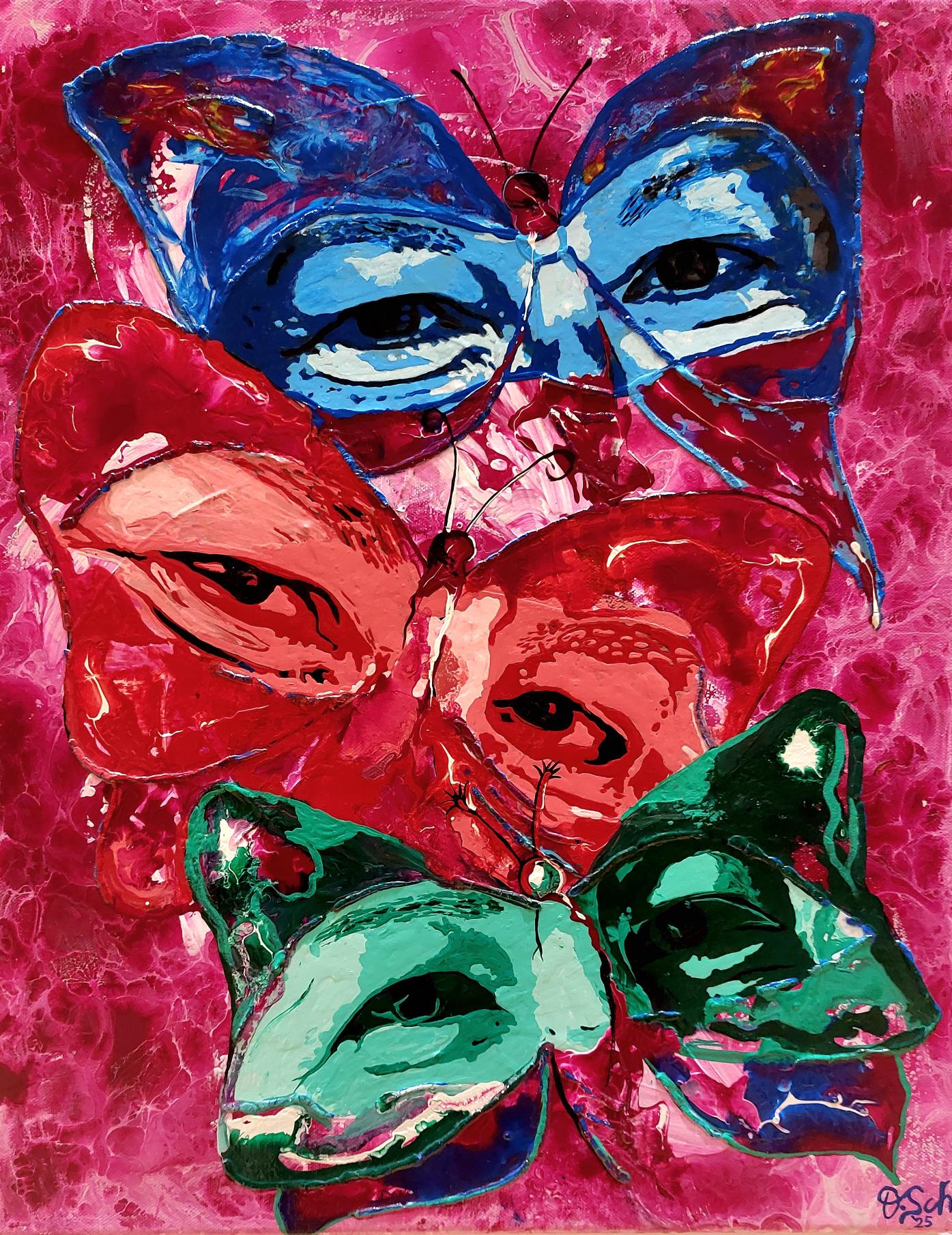 Drei Paare von Augen schauen aus dem Werk hervor. Umrahmt von schmetterlings- oder auch katzengleichen Umrißen haben sie eine besondere Bedeutung für den Künstler.