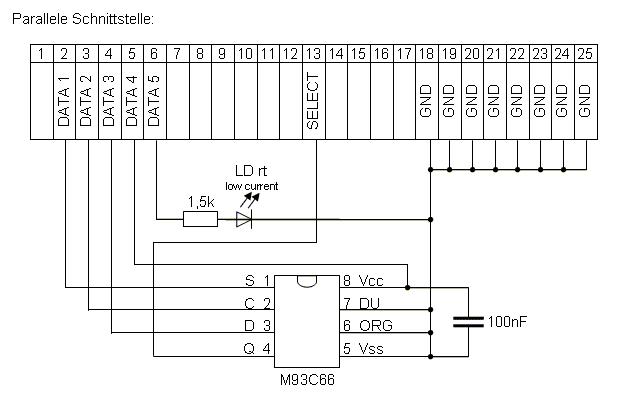 und die notwendige Programmierung unter MS-Excel-VBA vornehmen. Der Einfachheit halber soll die Programmierung am PC über die größtenteils noch vorhandene paralelle Schnittstelle erfolgen. Die Programme sollen alle Möglichkeiten der Programmierung des EEPROMS M93C66 ausschöpfen, d.h. schreiben von Bits, lesen gezielter Bits, und schützen des Speicherinhalts. |